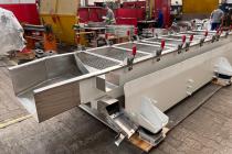 Mavi Máquinas Vibratórias de São Paulo, Brasil, testa equipamento extra-longo com vazão regulável para alimentação de sistemas classificadores de sucata moída de placas eletrônicas. Ao mesmo tempo ocorre inspeção visual. Equipamento em teste, sem pintura.
